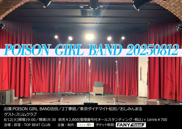 ・整理番号順に案内となりますが、オールスタンディングですのでご注意下さい。 ・当日会場にて別途1ドリンク代700円必要。 ・未就学児は入場不可。出演者変更になる場合あり。 ・出演者変更による払い戻しはございません。 ・チケットの払戻は主催者判断での中止でない限り不可となりますのでご了承下さい。